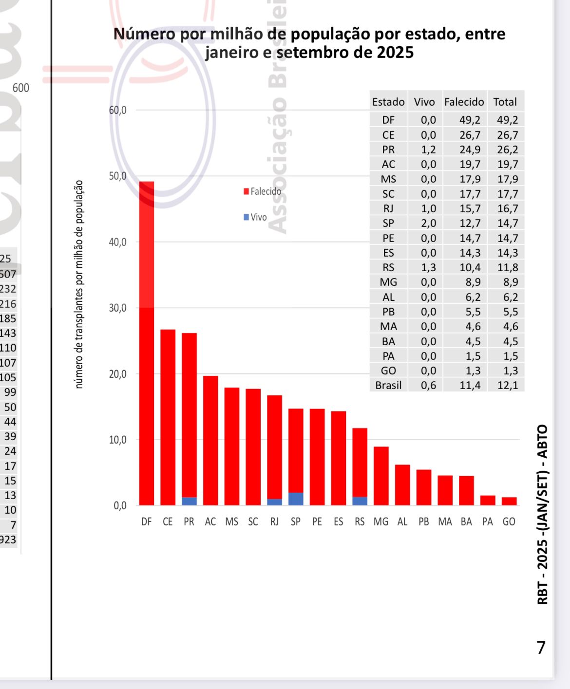Dados da Associação Brasileira de Transplantes de Órgãos (ABTO) mostram que, até setembro de 2025, o Distrito Federal registrou uma taxa de transplantes hepáticos de 49,2 procedimentos por milhão de população (pmp), contra a média nacional de 12,1. Esse desempenho mantém o DF na liderança nacional desse indicador desde o início do programa de transplantes em 2012.