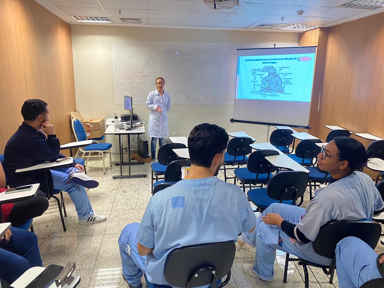 O Serviço de Controle de Infecção Hospitalar (SCIH) do Instituto de Cardiologia e Transplantes (ICTDF) promoveu, nesta semana, o treinamento sobre Prevenção de Infecções Relacionadas à Assistência à Saúde (IRAS), com foco na Infecção de Sítio Cirúrgico (ISC) e na Infecção do Trato Urinário (ITU). A capacitação foi direcionada aos profissionais de Enfermagem e oferecida em diversos horários ao longo de dois dias, garantindo a participação de equipes de todos os plantões.
